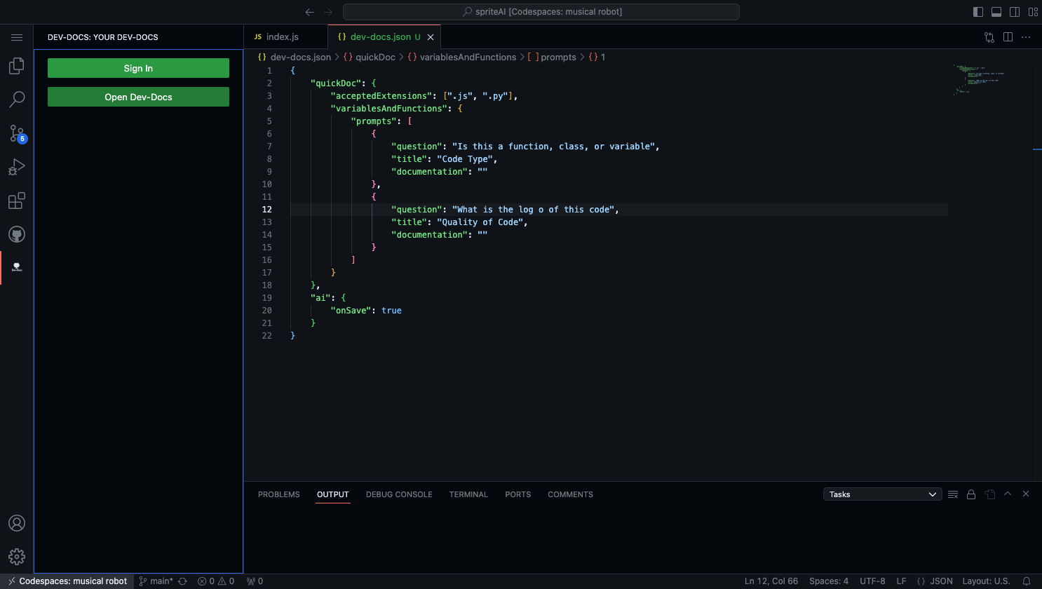 Out of the box, Dev-Docs will document your codebase by letting you know what each function, class, or variable does on a case by base basis. Below you'll see a step by step guide on how to start generating docs from your VS Code editor.